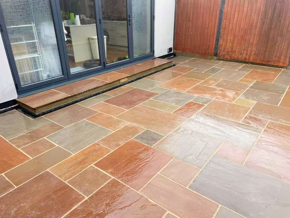 Part of the character of Sandstone paving is that no two stones are coloured the same; however, when combined they create a rich tapestry of colour to make an overall hue as presented here. Seasonal changes also bring differing perspectives to the reflected colours. In strong summer sunlight a sandstone patio will appear to have less colour variation, whilst after rain the colours will be of deep patina.